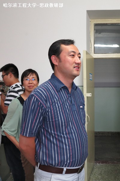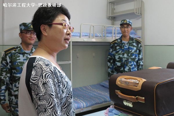 思政部领导先来到九公寓男生寝室进行探望,男生们身着军装,以整齐的军姿迎接院系领导。陈坤仔细询问新生的生活情况,了解他们的饮食情况,亲切的询问各位同学的家乡,以及是否适应哈尔滨的天气。同时寝室同学也向院系领导反映自己所遇到的困难,并与领导积极交流商量解决办法。在慰问过程中,陈坤主任幽默的言谈风格一步步拉近与员工之间的距离,欢声笑语充盈在寝室之中。