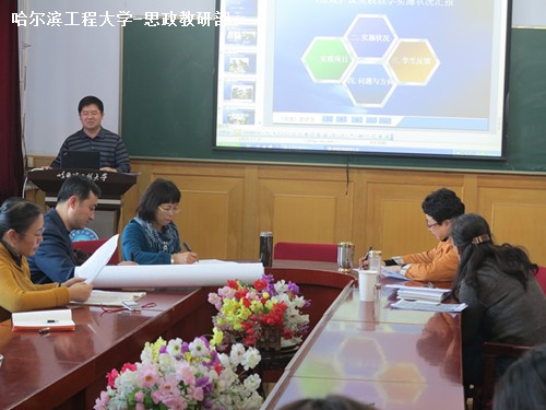 刘贵占老师代表马克思主义原理教研室做汇报。他从实施项目、效果、问题与方向等方面做了具体阐述,并播放了员工拍摄的微电影精彩画面。员工拍摄的微电影富有创意,赢得全体教师的阵阵笑声。姜虹老师代表形势与政策教研室就“与陌生人交谈”和“法律专刊的设计”2项实践教学的实施与成效作了介绍。姜虹老师展示了2幅员工设计的法律专刊,其精美与高超的水准赢得在场教师的称赞。梅学霞老师代表近代史纲要教研室以PPT的形式作了实践教学的总结。梅学霞老师就参观爱国主义教育基地和案例教学的教学实践和教学效果作了分析总结。王红老师受邓小平理论教研室的委托就毛泽东思想与中国特色社会主义理论体系概论的实践教学作了汇报。