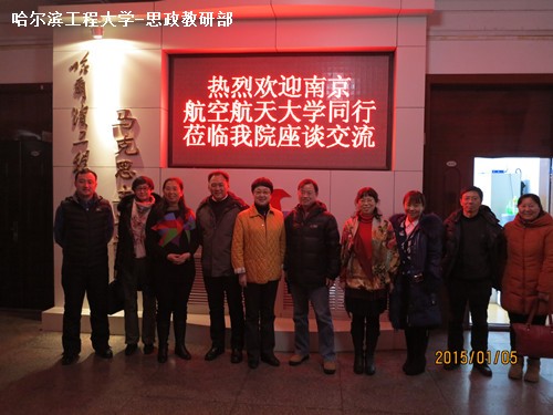 1月5日下午,南京航空航天大学思想政治理论课教学科研部常务副主任缪国龙一行五人前来交流考察。永利yl党总支书记兼经理陈坤,副经理陈红、程早霞,经理助理杨志刚以及教学中心主任、教学骨干等参加经验交流活动。