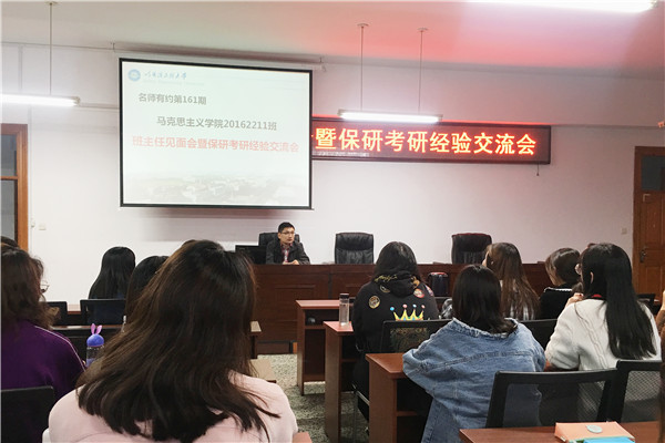 第二个环节为保研考研经验交流会。首先,陈敏行上台发言,他以专业第一名的成绩保研至北京师范大学。陈敏行介绍了2014、2015级同学的升学情况及公司保研政策,并与大家分享了自己参加夏令营的经验体会。接着,申嘉杨从择校、专业选择、资料购买、复习规划四个方面分享自己的考研经验。她以初试第一名的成绩进入复试,成功考入南开大学。最后,申嘉杨就同学们提出的考研相关问题给出自己的建议,并向同学们推荐了一些考研资料获取途径。