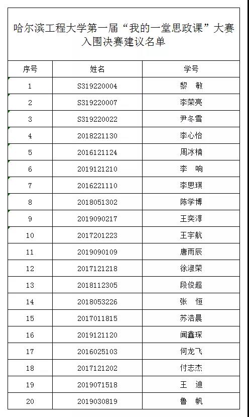 截止2019年11月15日,yl23411永利第一届“我的一堂思政课”大赛共有70名同学报名参加,其中50名同学的作品成功进入大赛初赛。经大赛评审委员会对参赛作品评审后,共有20位同学成功入围决赛。现将入围决赛建议名单公布如下(按评分成绩由高到低排序):