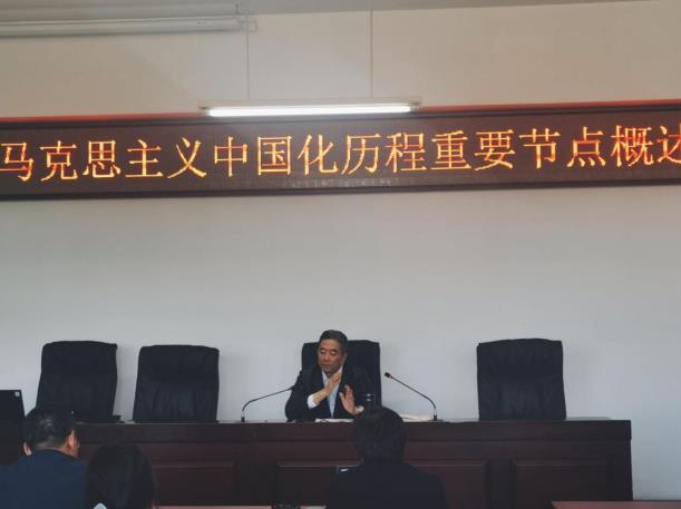 接着,杨书记详细梳理了新民主主义革命时期马克思主义中国化历程的重要节点,详细分析了中国共产党发展历程上的重大历史事件在马克思主义中国化进程中的重大意义。他系统阐述了在新民主主义革命时期马克思主义中国化发展进程。在中国共产党初创到大革命时期马克思主义中国化成果为:第一,民主革命必须由无产阶级领导;第二,必须进行土地革命和掌握革命武装。在土地革命时期马克思主义中国化成果为:第一,毛泽东提出了农村包围城市,武装夺取政权的思想;第二,中国共产党开始独立自主解决中国革命实际问题;第三,中国特色的哲学思想武装了中国共产党。在抗日战争和解放战争时期马克思主义中国化成果为:党的七大确立了毛泽东思想为党的指导思想,标志着马克思主义中国化的第一次历史飞跃。