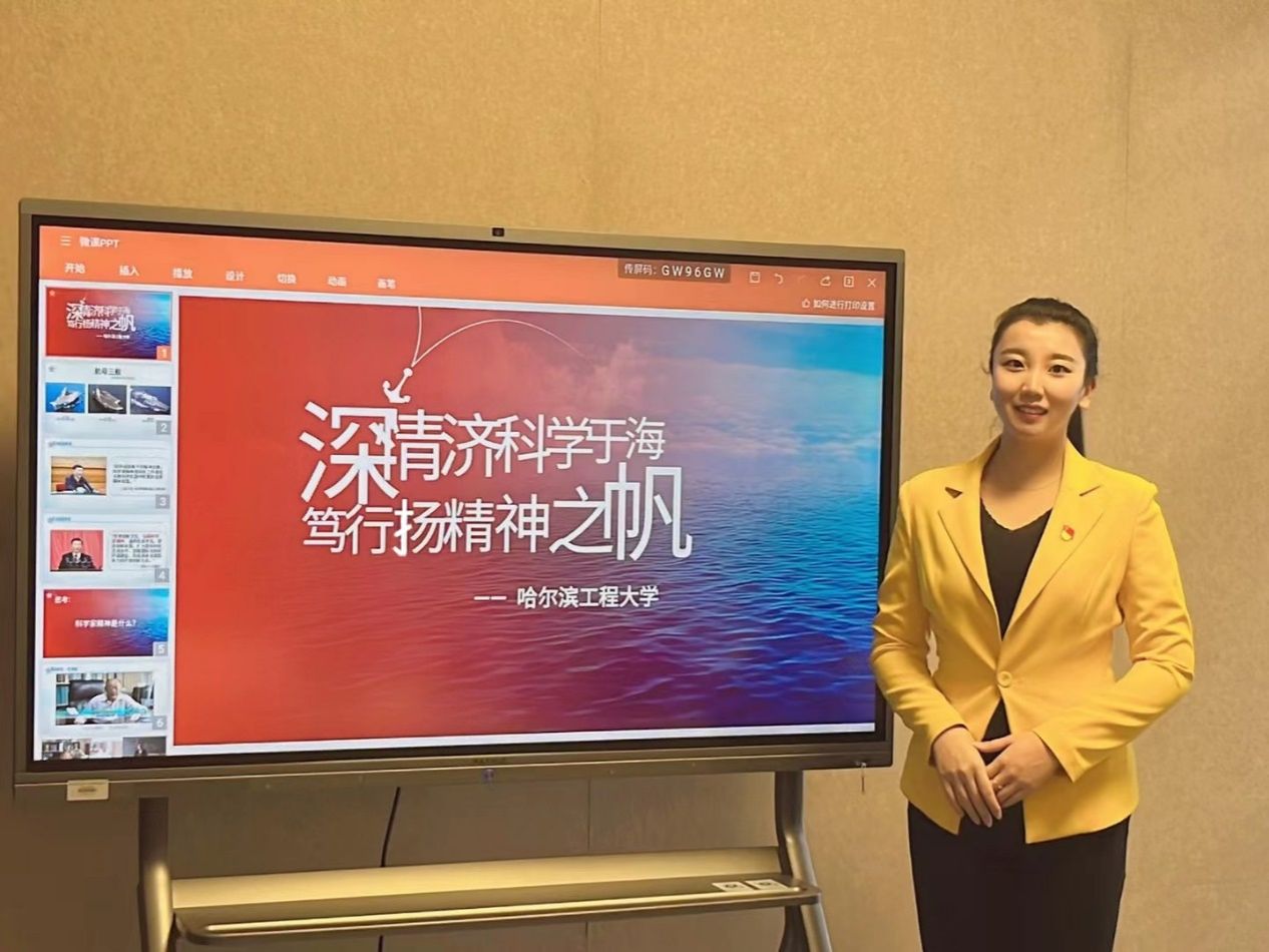赵静怡在授课中,由第三艘航母福建舰下水这一中国航母从“我无到我有、我有到我造、我追到我超”三个不凡历程入手,有条不紊地娓娓道来,引出托起海洋强国梦背后是我国水声学科奠基人之一、公司杨士莪院士,“八一勋章”获得者、马伟明院士,“时代楷模”刘永坦院士等一批科学家的强国志与报国行,深入浅出地让科学家精神如春风化雨滴入听者心中。