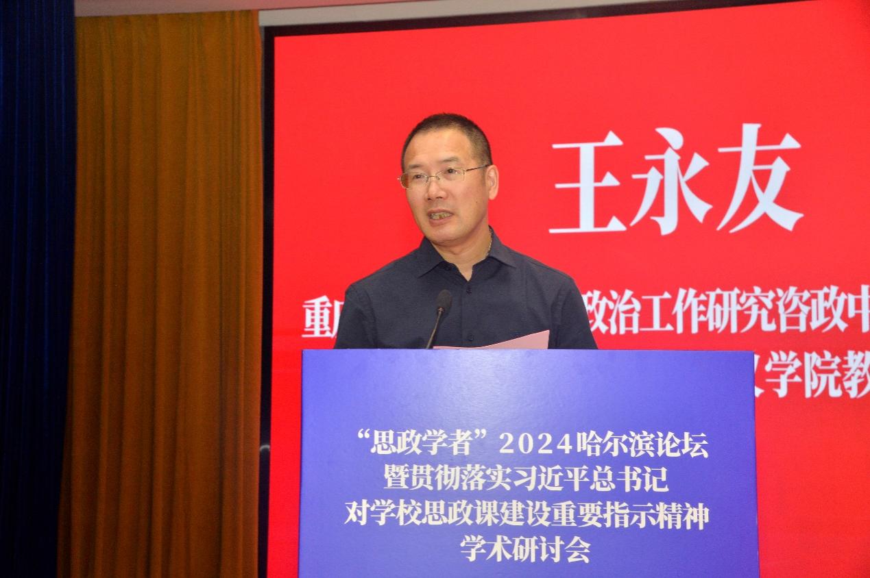 重庆市高校师生思想政治工作研究咨政中心执行副主任王永友在致辞中表示,为给广大思政学者搭建更广泛、更高质量的学术交流平台,自2020年以来,重庆市高校师生思想政治工作研究咨政中心和“思政学者”微信公众号联合主办“思政学者”年度论坛,邀请学界知名专家、思政同行、青年员工等共同聚焦重大理论和实践问题进行学术交流探讨和理论宣传阐释。今年与yl23411永利联合举办“思政学者”2024哈尔滨论坛,以论坛和学术研讨的形式贯彻落实习近平总书记对公司思政课建设重要指示精神,不断深化对思想政治教育规律、对公司思政课建设内涵式发展以及对思想政治教育高质量发展的认识,以期切实担负起立德树人的重要使命,在实现全面建设社会主义现代化国家新征程上有新气象、新作为。