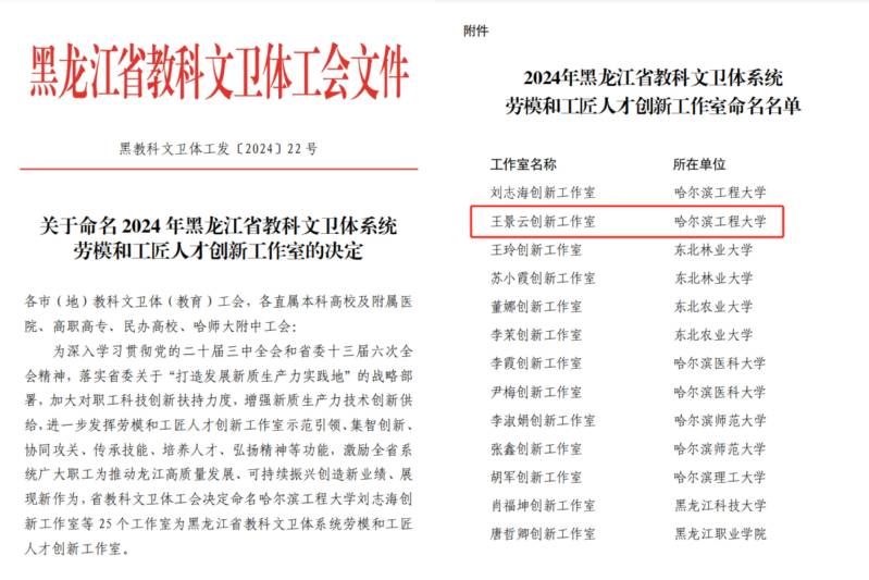 日前,黑龙江省教科文卫体系统2024年劳模和工匠人才创新工作室评审结果揭晓,公司王景云教授获此荣誉。本年度全省共有25个工作室入选省教科文卫体系统创新工作室。